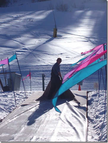 Part of the morning preparation when I worked out West was uncovering the "Magic Carpet". On this morning I captured a lift attendant, lifty. As the wind blew across the beginner area, the sun illuminated the thick leather covering, the shadows danced across the closed section of the trail above. What a beautiful morning.