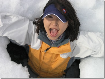 Capturing that good portrait moment is nearly impossible, for me, so when I have a good one, I just got to share. Taken in Japan in the spring, the running water had rotted the snowpack from below making this fun snow hole. Then the perfect smile/scream expression to boot. Enjoy!