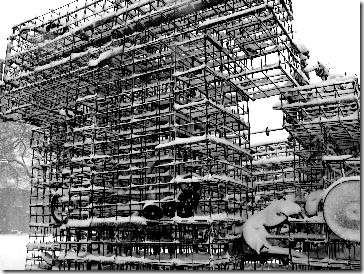Honestly, this thing is weird. No ifs, ands, or buts about it. I walk by it all the time and it never gets any less weird. I took this recently with the intent of making it black and white. I opened up Photoshop, made it black and white and didn't notice the change at first. That's how bland in color this thing is. Normally it is just rusted brown. Boring rusted brown. With snow it got much more exciting. Enjoy.